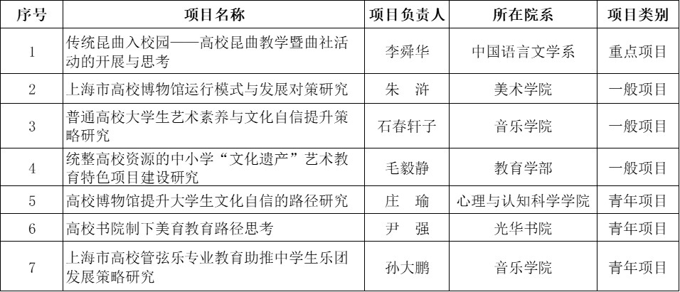 近日,2019年上海市学校艺术科研项目立项名单公布,共86项项目确定立项,其中重点项目10项,一般项目40项,青年项目36项。我校共7个项目获得立项,立项数排名第一,创我校历史最好成绩。