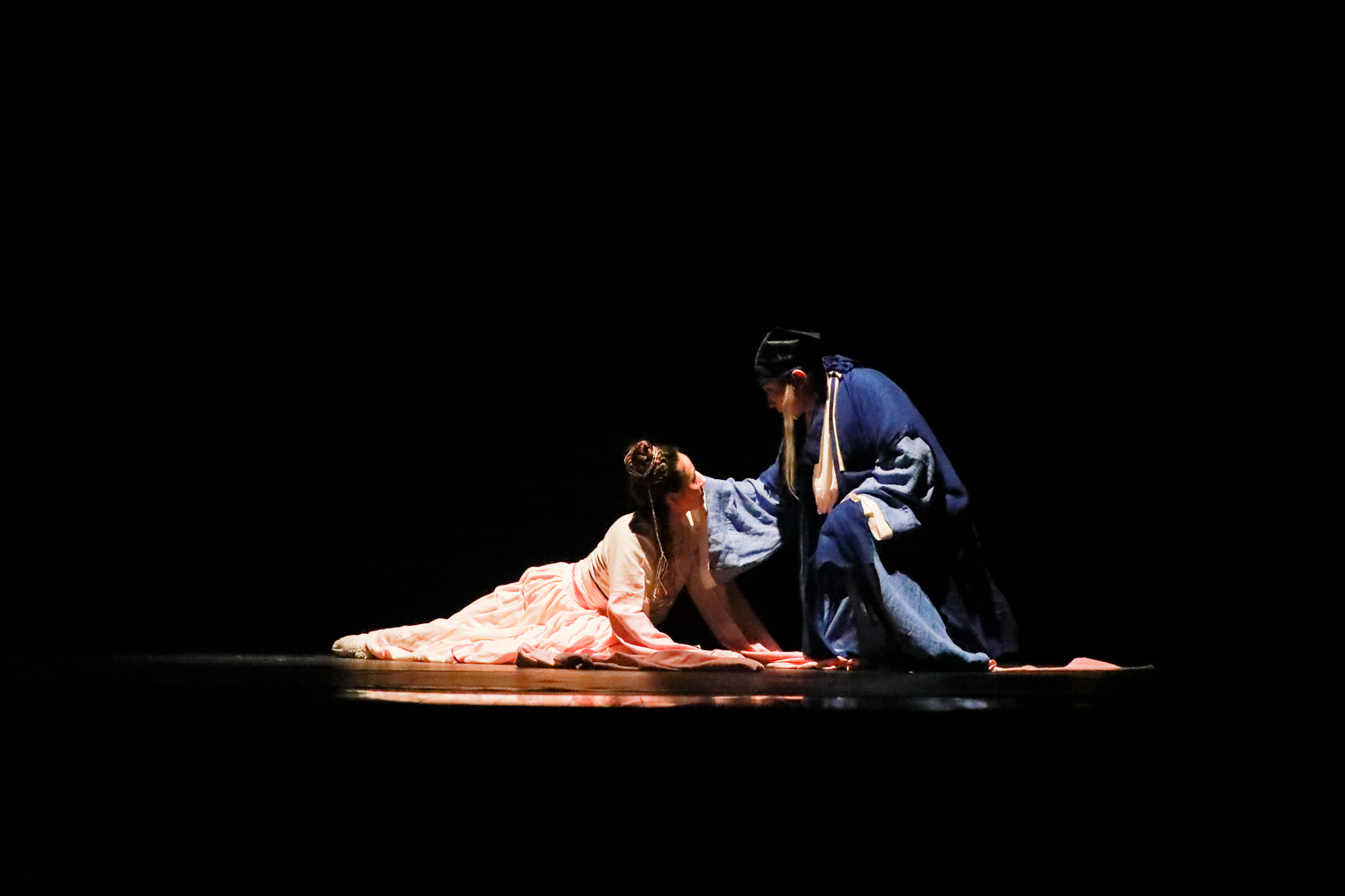 这部舞台剧以流传千年的中国传统爱情故事为蓝本,通过新颖的西方视角演绎了一出别开生面的“白娘子传奇”。演员们有着传统戏曲扮相,又在表演中融入了大量动感的现代化的肢体语言,一个动作、一个眼神都有着极强的感染力,热烈与内敛碰撞,现代与古典交融,现场观众或喜或悲、深深沉浸在这场视觉和听觉的美妙之旅中。该剧的舞台布置与造景同样出彩,舍弃了一般舞台剧使用的假山假石、屏风等笨重琐碎的道具,舞台上仅留几扇白幕,在这宛若国画画纸的投影白幕上,山水、游船、端午龙舟、雷峰塔等景象逐一显现,在方寸舞台之上展示了壮阔的古寺与湖山。遍布舞台的浓墨重彩勾勒出一幅幅动人的水墨画,为演员的表演提供了一个大气而绚丽的场景。
