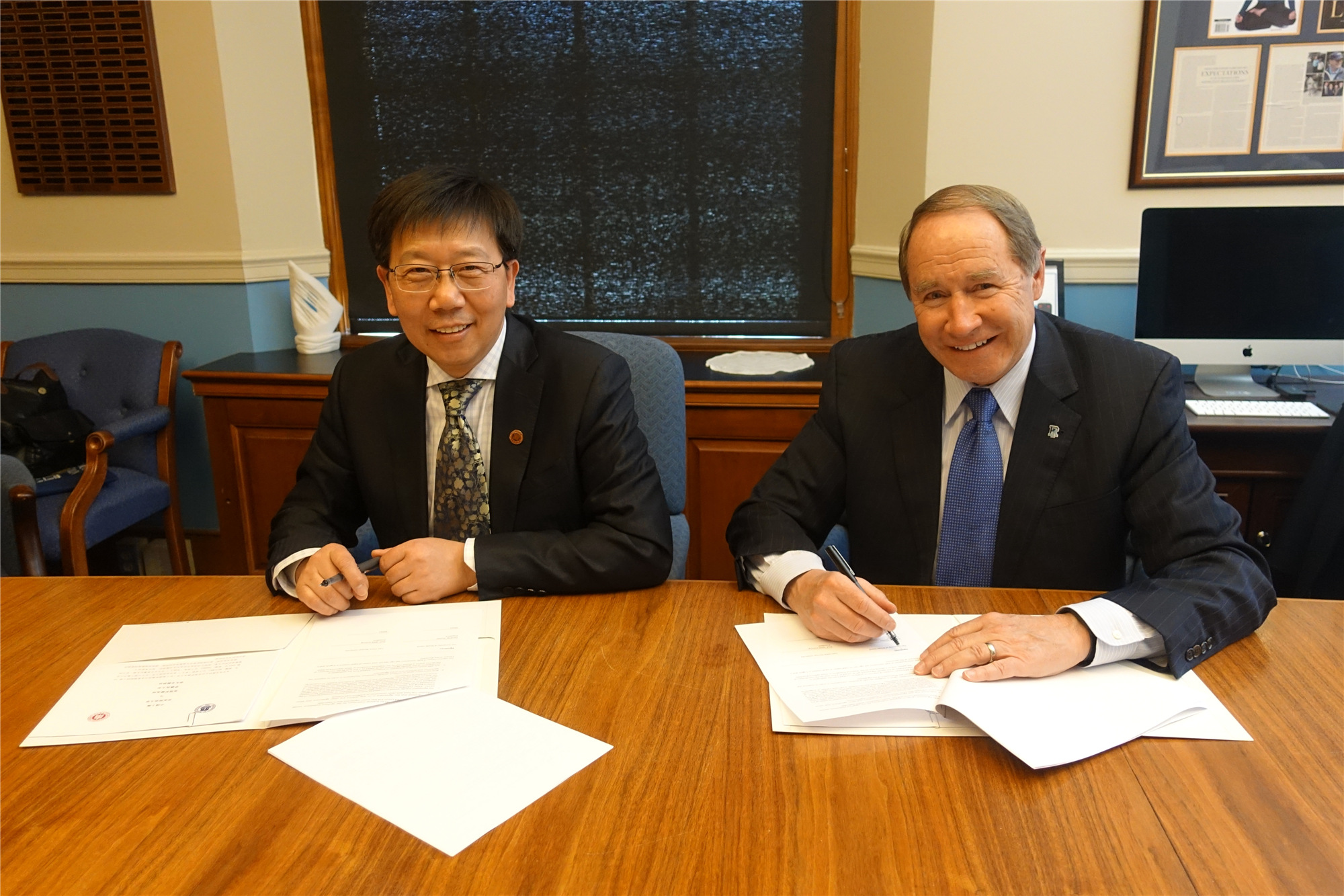 校长钱旭红与罗德岛大学校长David M. Dooley共同签署两校交换生协议