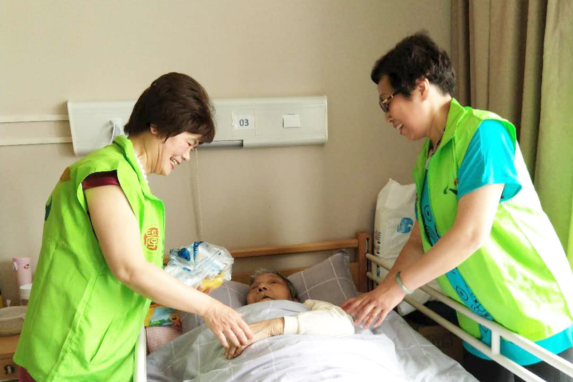 演出及送祝福活动结束后,志愿者们还分组前往老人房间探望卧床及行动不便的老人,快乐的时光总是短暂,离别之时依依不舍,老人们对志愿者们的到来和慰问表示诚挚地感谢,他们得到了精神上的慰藉,并欢迎志愿者们再来探望慰问。
