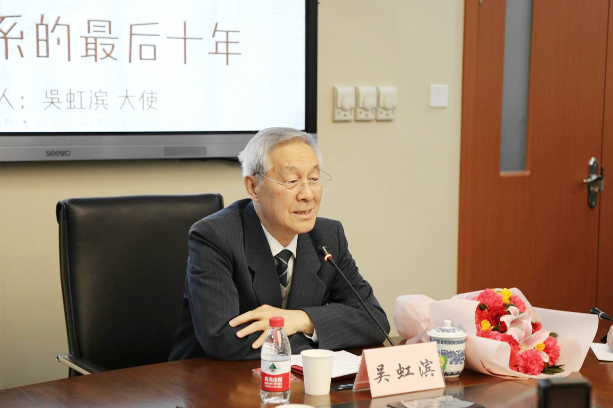 3月27日下午,应beat365英国官网网站俄罗斯研究中心、国际关系与地区发展研究院“大使讲坛”邀请,中国前驻塔吉克斯坦、白俄罗斯、土库曼斯坦大使,中国中亚友好协会副会长吴虹滨作“庆祝中俄建交70周年系列讲座”《中苏关系的最后十年》主题演讲。讲座于理科大楼举行,由国际关系与地区发展研究院党总支书记、俄罗斯研究中心副主任贝文力主持。来自我校各院系和兄弟院校的师生代表共同聆听了演讲。