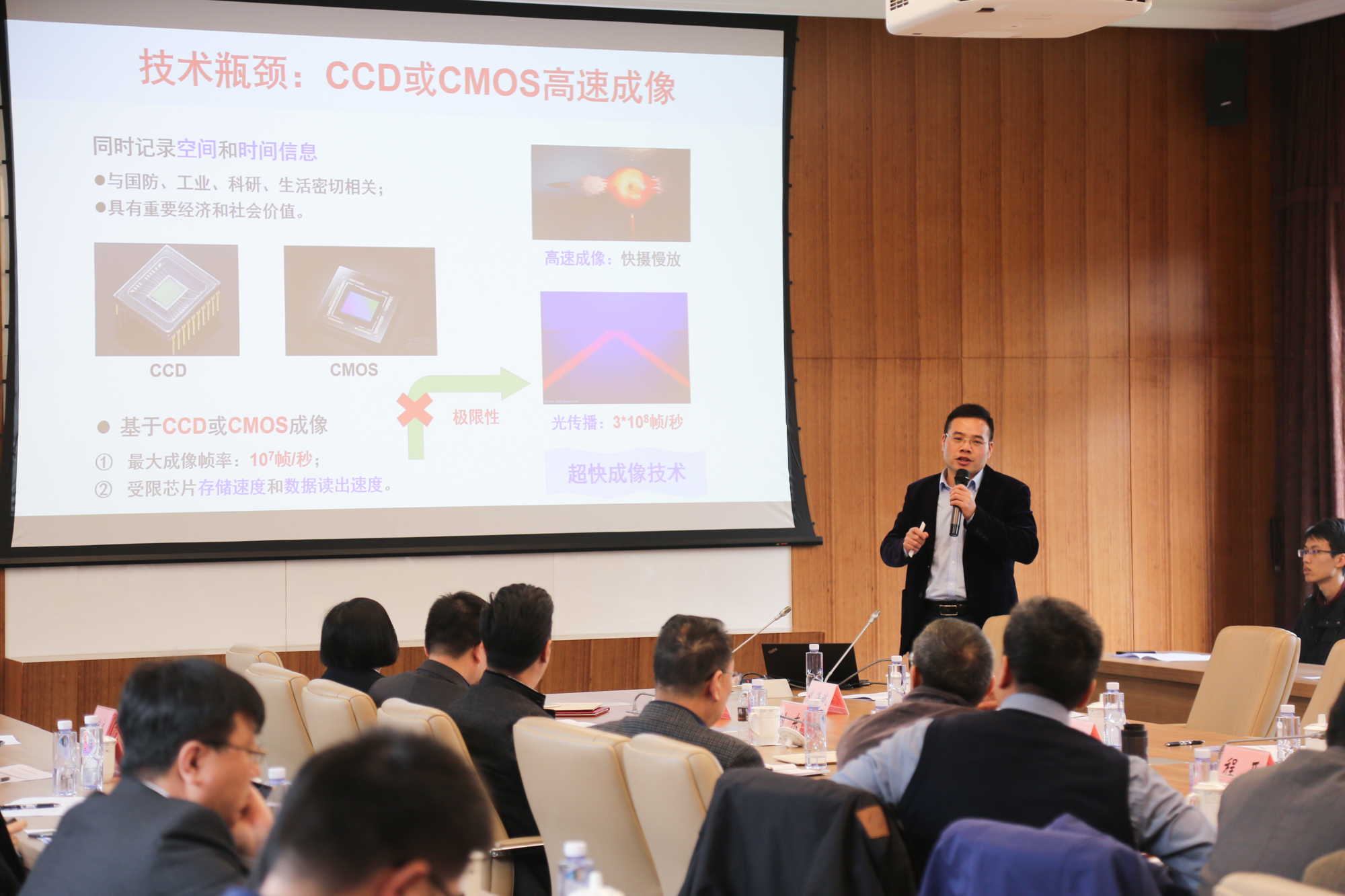 精密光谱科学与技术国家重点实验室主任吴健教授向行业技术顾问委员会作了实验室整体情况汇报,介绍了实验室的研究方向、人才队伍、近期研究进展等。实验室吴光研究员作了“单光子测距及成像技术与应用”的研究进展报告;李文雪研究员作了“飞秒光学频率梳的技术与应用”的研究进展报告;张诗按研究员作了“压缩超快成像技术与应用”的研究进展报告;徐信业教授作了“冷镱原子光钟技术与应用”的研究进展报告;程亚教授作了“超快激光微纳加工技术与应用”的研究进展报告。
