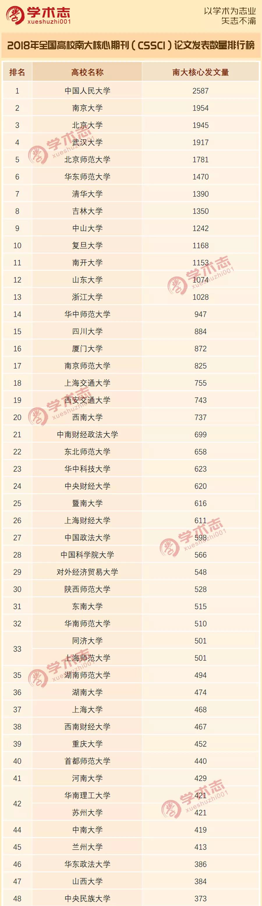 榜单显示,在2018年全国高校南大核心(CSSCI)论文发表数量上,排名高校一共发表了78661篇南大核心期刊论文。居于榜单前十的还有:中国人民大学、南京大学、北京大学、武汉大学、北京师范大学、清华大学、吉林大学、中山大学、复旦大学。排名前10的高校一共发表16804篇南大核心期刊论文,占总体论文总数的21.3%。