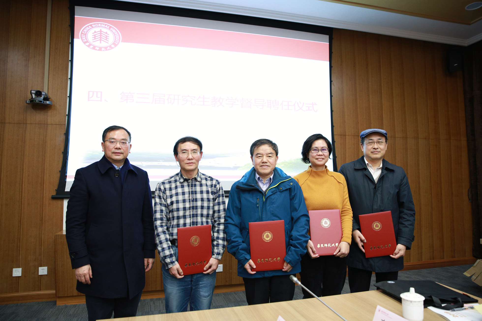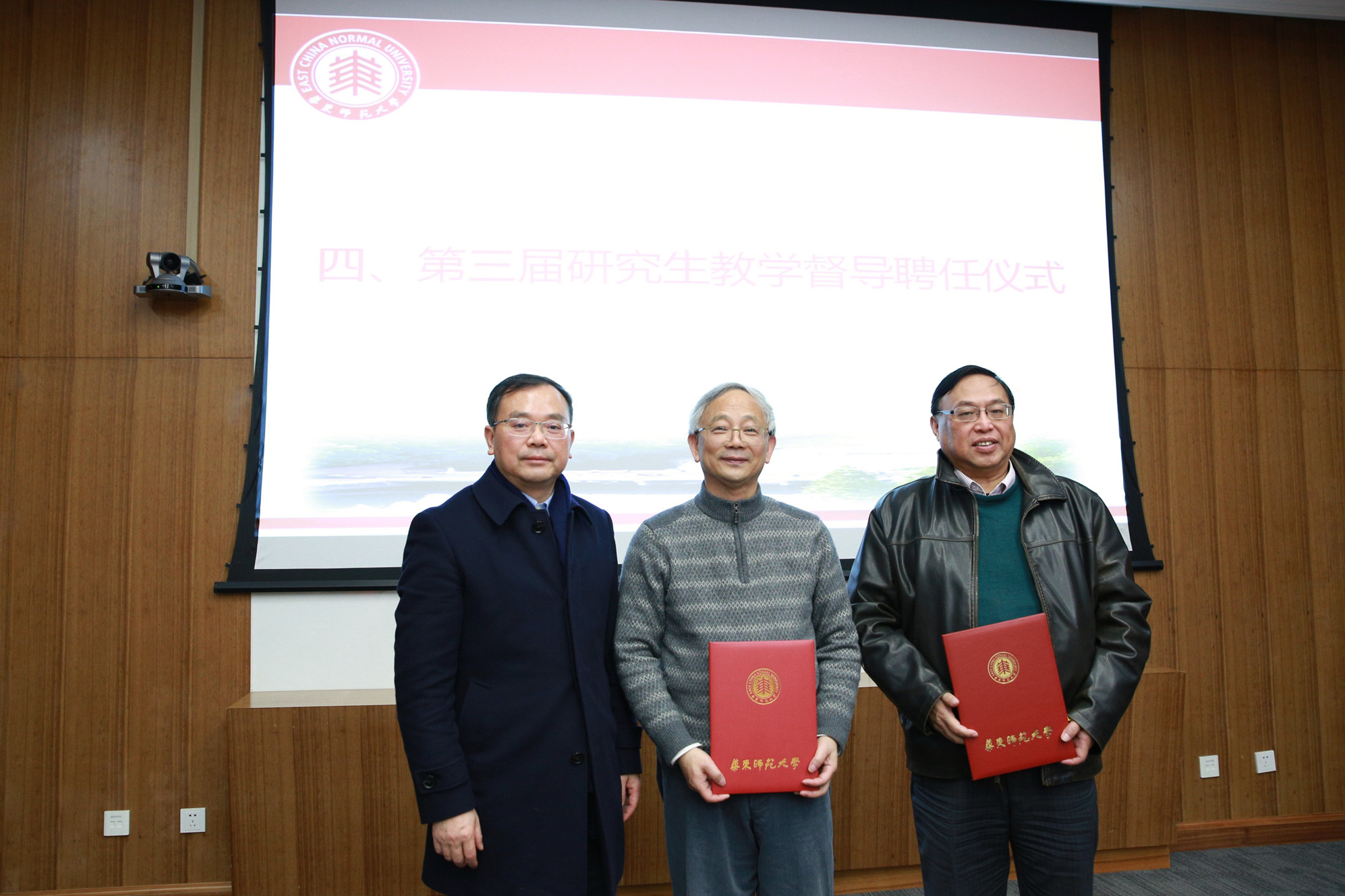 随后,研究生院培养办公室主任陈灵犀对第三届研究生教学督导换届工作进行了汇报,从教学督导组的构成、督导组成员产生方式、督导组工作职责,以及督导工作形式多个方面详细汇报了第三届督导人员的产生过程。接着张文宣读了《beat365英国官网网站“关于公布第三届研究生教学督导名单的通知”》文件。第三届研究生教学督导由32名教师组成,由化学与分子工程学院何品刚教授任组长,国际汉语文化学院吴勇毅教授任副组长。分设3个小组,中北组11人,闵行文科组12人,闵行理科9人。周傲英为第三届教学督导颁发了聘书并合影留念。