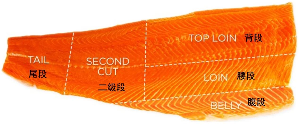 国际海产贸易行业对三文鱼片的分区背段、腰段、腹段、二级段和尾段。