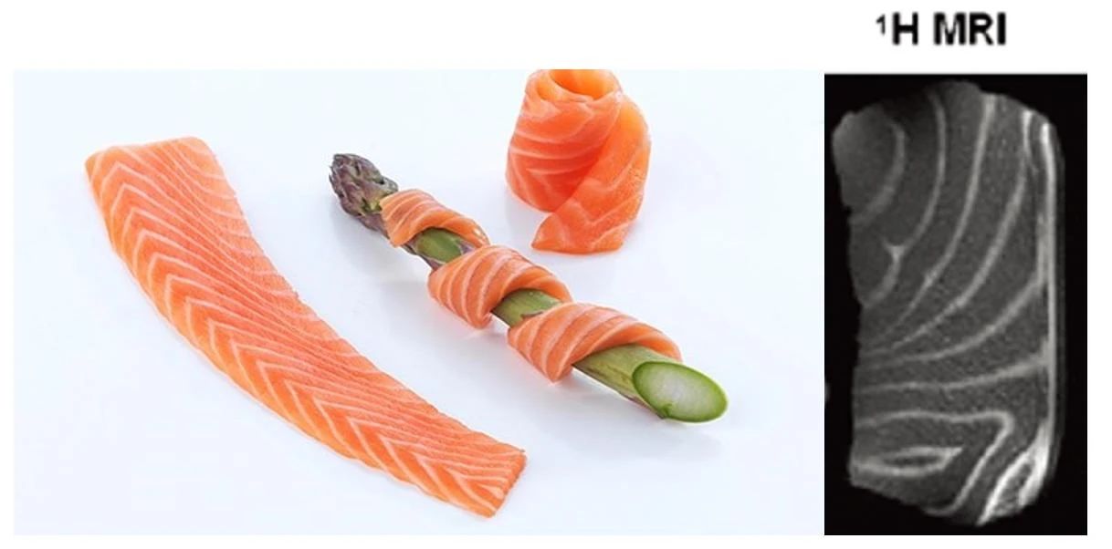 三文鱼鱼片腹段及其核磁成像图[14] 其中白色部分为肌间脂肪组织。