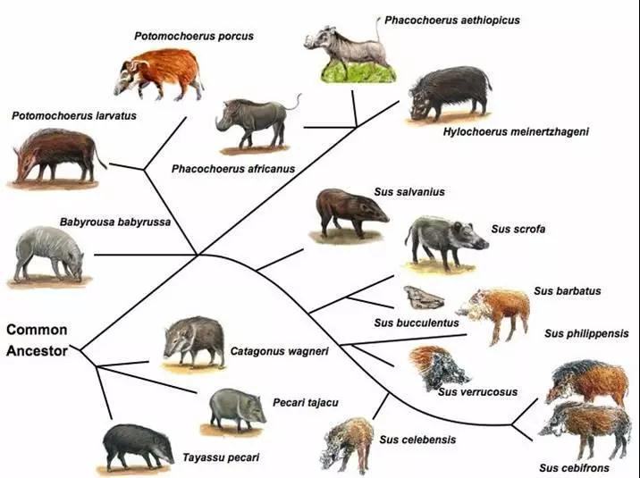 说完了汉字中的猪故事,我们来看看猪类所属的猪科家族,其中还有很多物种很有来头。全世界现存一共有17种猪科动物。简单划分的话,可以区分为三个亚科,分别是猪亚科Suinae、疣猪亚科Phacochoerinae和鹿豚亚科Babyrousinae。其中鹿豚亚科Babyrousinae,只有鹿豚一个属。鹿豚(英文为Babirusa)可谓是长相最为奇特的猪,它们分布于印度尼西亚的苏拉威西岛等几个岛屿。近年来的研究把它们划分为三种,分别为鹿豚Buru babirusa(学名Babyrousa babyrussa)、苏拉威西鹿豚Sulawesi babirusa(学名Babyrousa celebensis)、托吉安鹿豚Togian babirusa (学名Babyrousa togeanensis)。