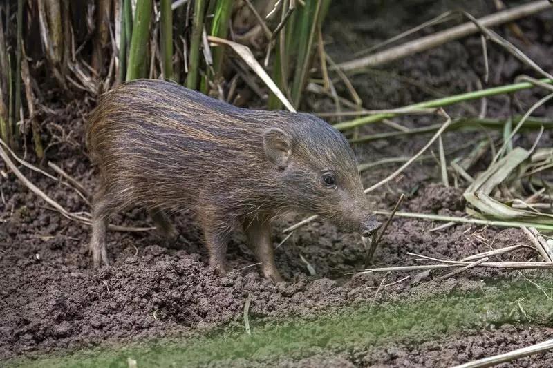 让我们将视线转向亚洲,在这里,除了广布的欧亚野猪,还有一种世界上最小的猪科动物——姬猪属的姬猪或者就叫小野猪Pygmy Hog(学名Porcula salvania)。它们的成年体长也只有55-71厘米,肩高只有20-30厘米,体重只有6.6-11.8公斤。人工培育的小香猪也要比它大不少,姬猪才是真正长不大的“小猪”。不过这么小的体型,可不能大摇大摆地生活。姬猪只分布于印度阿萨姆邦几个国家公园的密林中,面对栖息地的日益减少,它们的种群数量据估计只剩下不到150只,可谓是岌岌可危。