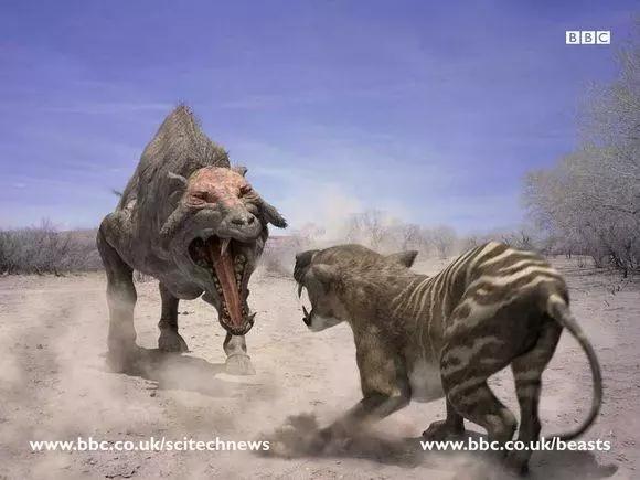 BBC纪录片《Walkingwith Beasts》中展现的完齿兽与鬣齿兽之间的争斗