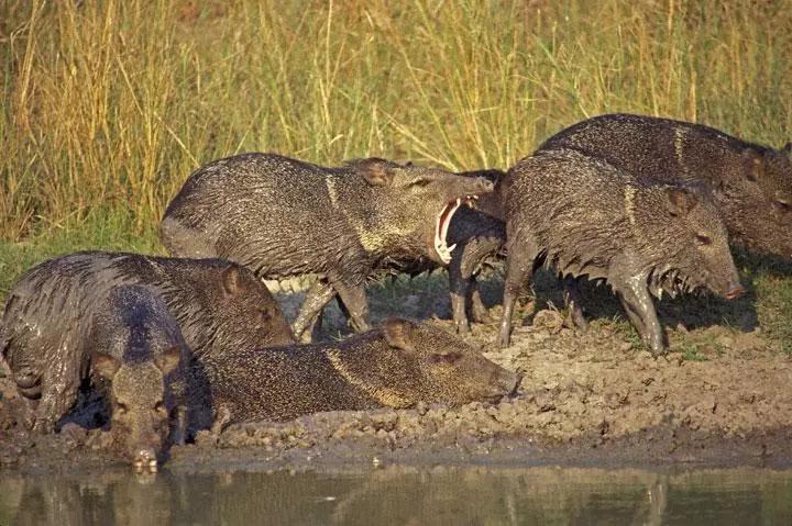 前面我们已经说过,在美洲,原本没有猪科动物的存在。不过,在那里倒是生活着几种长得和野猪们有几分相像的动物,它们被称为西猯,英文是Peccary。之前,人们认为一共有三种西猯,分别是白唇西貒White-lipped Peccary(学名Tayassu pecari)、中美西貒或者叫领西貒Collared Peccary(学名Pecari tajacu)、草原西貒Chaco Peccary(学名Catagonus wagneri)。