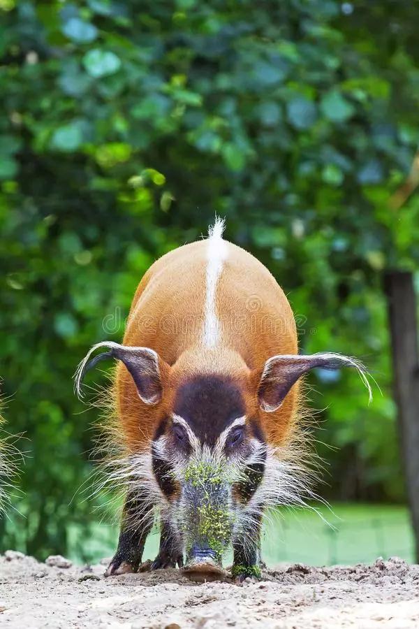而假面野猪属的代表红河猪体重只有45-115公斤,体长只有1-1.4米,比大林猪小不少。红河猪分布于西非和中非潮湿的森林地带,它们的体毛为醒目的橙红色,再加上黑色的腿和沿背部中线分布白色簇状毛发,使它们十分亮眼。红河猪的面部黑白相间,再加上耳簇的长毛,使它们一副滑稽的长相。