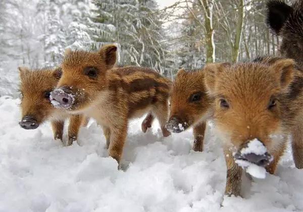 野猪每胎能够生下5、6只幼崽,这和其他野生的鹿、羊等每胎1、2只幼崽的动物相比,可谓是“超生”游击队。正因为如此,野猪仍然是很多捕食者的捕猎对象。尤其是那些年幼的小野猪。小野猪看起来总是萌萌哒,它们的身上常常具有褐色、棕色相间的条纹,这有利于它们隐蔽自己。尽管如此,它们还是许多野兽甚至猛禽的捕捉对象。