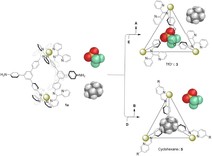 与以往报道的通常将吡啶甲醛作为超分子金属笼的核心组装基元不同,该研究首次引入二吡啶基酮作为超分子金属笼的核心组装基元。有趣的是,二吡啶基酮的两个相同吡啶基元在目标超分子金属笼中扮演着不同的角色,一个参与组装配位,而另一个则调控目标超分子金属笼的主客体性质、稳定性以及酸碱响应性。基于此,成功实现了酸碱刺激下超分子金属笼之间重要阴离子的可控运输与可控交换(图4)。该类新型超分子金属笼有望实现生命体系中药物分子的靶向递送和可控释放(Angew. Chem. Int. Ed., 2020, 59, 7435)。