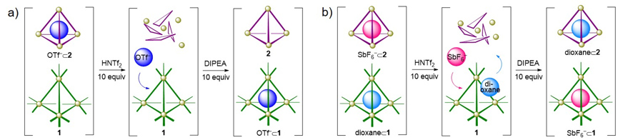 图4. 酸碱刺激下超分子金属笼之间阴离子的(a)可控运输与(b)可控交换