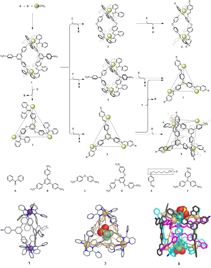 图3. 含二吡啶基酮超分子金属笼的结构及其主客体复合物晶体结构