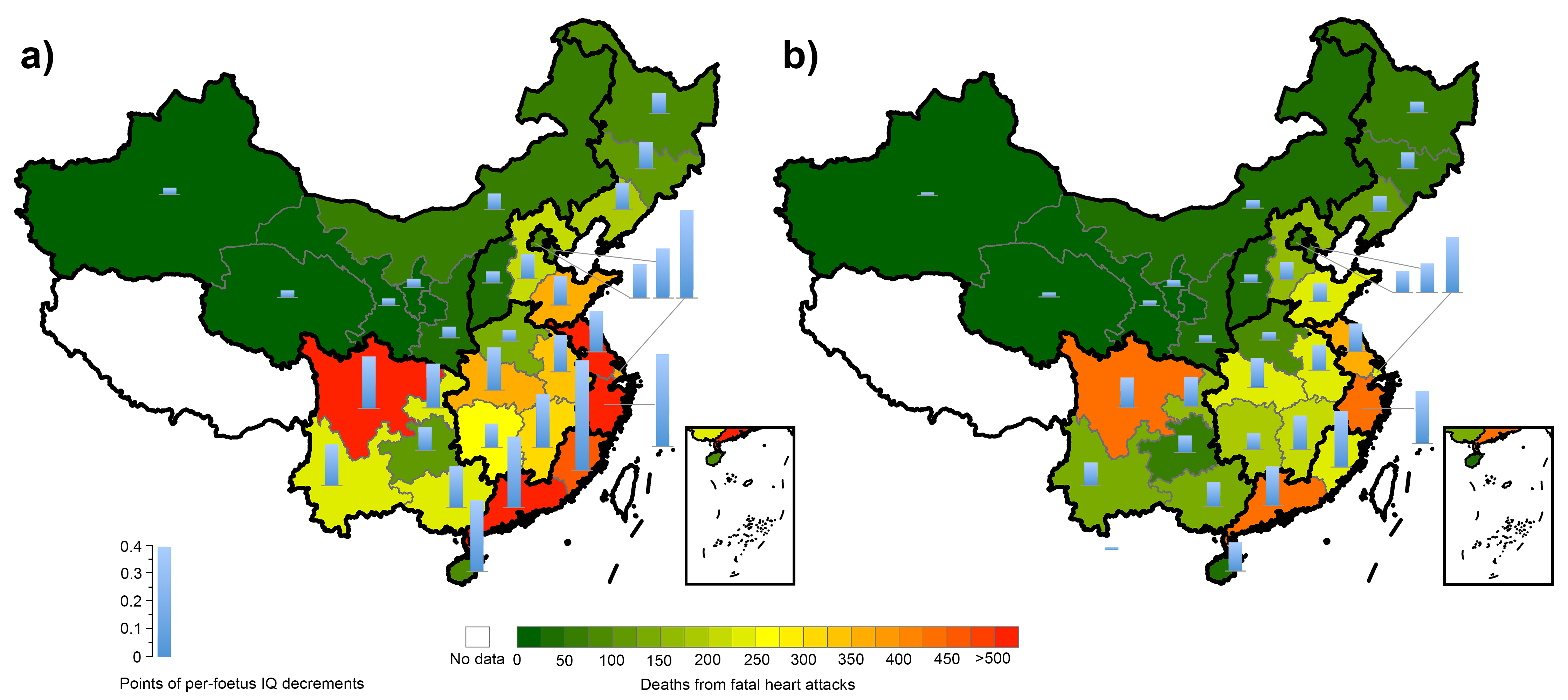 通过运用这套方法,束炯教授团队首先展示了2010年中国大陆人群汞摄入暴露的健康风险地图。风险地图分别展示了2010年各地区人群因汞摄入暴露而出现的胎儿智商损失和汞关联性成人心脏病死亡。