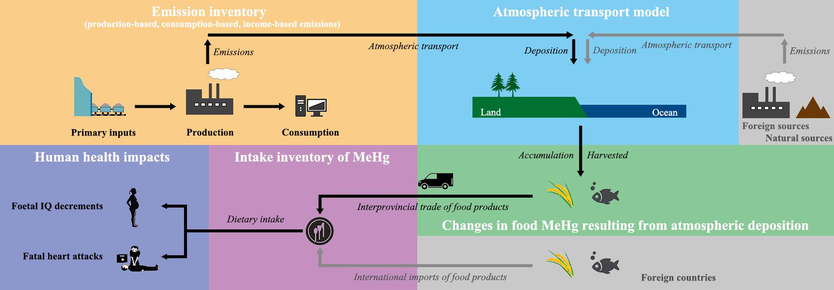 束炯教授团队的研究耦合了多区域投入产出模型、大气汞排放清单编制、大气化学传输模型、食物汞浓度响应关系、人群汞摄入清单编制及汞暴露健康风险评估模型等多领域研究方法,首次建立了一套描述从经济活动到人群健康风险的汞生物地球化学循环链的方法。循环链中,最终消费和初始投入等经济活动驱动工业生产,工业生产排放汞进入大气并进行迁移、沉降、富集、甲基化、摄入暴露及健康效应等过程。该方法可用于评估人类经济活动如何影响人类自身汞暴露健康风险。