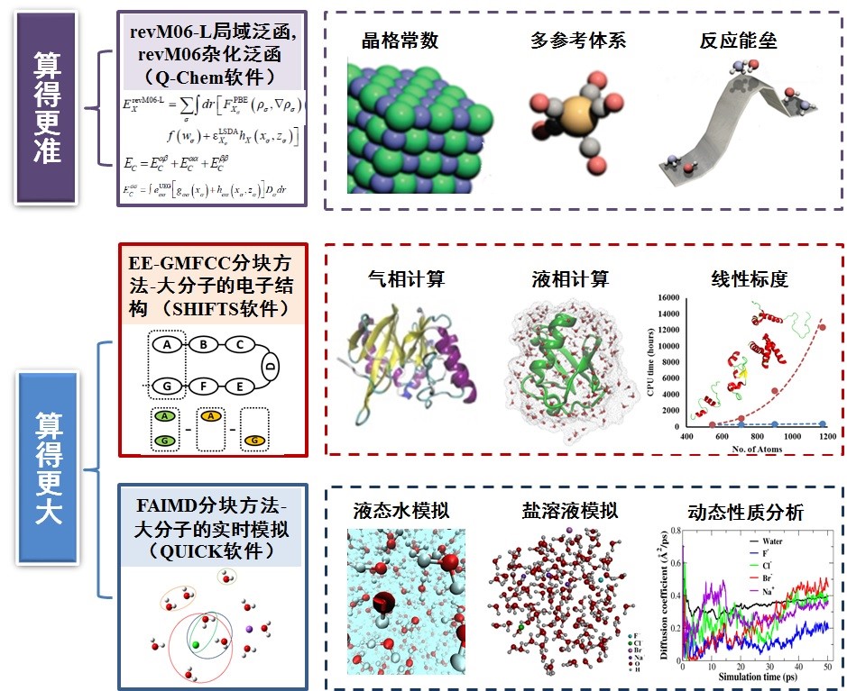 何晓研究员近年来围绕理论化学算得更准算得更大的核心科学问题,主要致力于分块量子化学方法和高精度密度泛函的发展与应用,并在此基础上开展了系列的应用研究并取得了系列创新性成果:第一,通过发展精确的大分子区域化分块量子化学方法,引入量子多体相互作用和环境极化效应将大分子的量子总能量计算降为线性标度,并且与全体系的计算结果高度吻合;率先将分块量子化学方法应用于周期性体系的红外、拉曼光谱和生物大分子的核磁共振波谱(NMR)的模拟,开发了基于第一性原理计算生物大分子核磁共振波谱的AF-NMR软件,并被诸多实验课题组广泛使用,何晓研究员提出的分块量子化学方法可以很容易的实现大规模并行计算,并且计算不受体系大小的限制,可以适用于包含几十万个原子体系的第一性原理计算,突破了传统量子化学方法的局限。第二,将分块量子化学方法与分子动力学模拟结合,首先实现了在耦合簇理论水平上的复杂大分子体系的从头算分子动力学模拟,精确给出了液态水和盐溶液内分子间的动态氢键作用网络和微观结构,首次验证了实验上提出的液态水中水分子以超低配位数的环链式结构与四面体结构并存的混合状态存在形式,颠覆了液态水以水分子构建的四面体结构存在为主的传统观念。第三,提出了新的可同时适用于化学和凝聚态物理体系的高精度局域密度泛函revM06-LMN15-LESI 1%高被引论文),和适用于含主族元素和过渡金属等分子体系精确计算的全局杂化泛函revM06MN15ESI 1%高被引论文),这些新的密度泛函已被诸多研究小组广泛使用。上述工作为定量研究复杂大分子体系的新颖量子性质、水溶液中分子间相互作用动力学的量子机制,以及精确预测大分子和材料体系的性质提供了高效而精确的理论新工具。