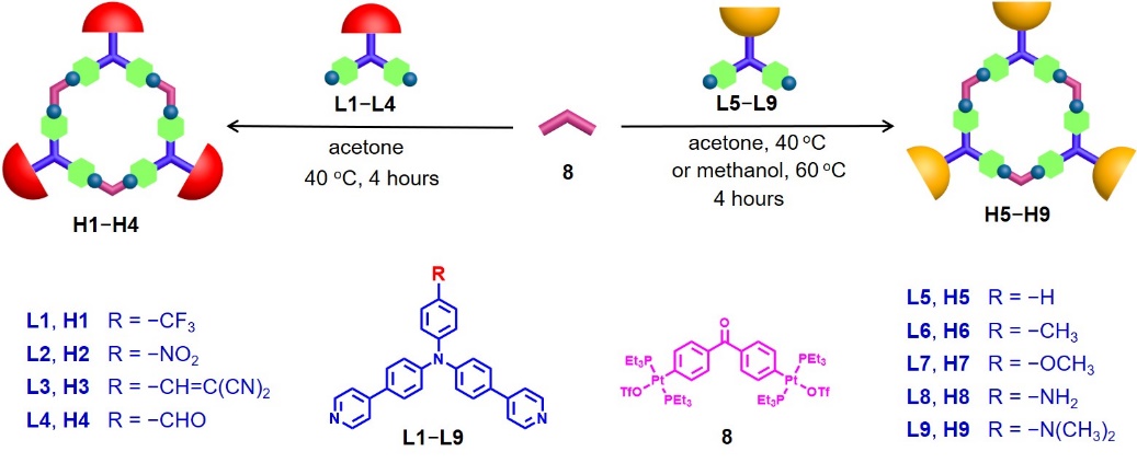 在前期研究工作的基础上,近期,徐林教授通过合理的分子设计,合成了光诱导电子转移(PET)和分子内电荷转移(ICT)可精准调控的超分子荧光基元(图1)。在荧光基元与重金属Pt (II)配位过程中,抑制了荧光基元中吡啶孤对电子的PET效应,导致组装后荧光量子效率提高;此外,Pt (II)与吡啶的配位还会增强吡啶的拉电子效应,引起ICT效应的加剧,从而导致组装后组装体的波长位移放大,实现超分子荧光金属组装体荧光宽程发射。值得注意的是,在传统的Pt-吡啶配位组装体中,由于难以实现通过吡啶基对组装基元的PET和ICT调控,Pt (II)的重金属效应往往导致超分子金属组装体的荧光减弱或淬灭,并较难实现对组装体的荧光性质的精细调控。