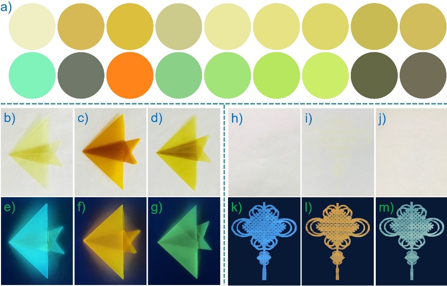 基于该系列超分子荧光金属组装体优异的荧光性能,制备了可加工荧光薄膜、具有防伪打印性质的荧光墨水等多种超分子荧光材料(图2)。例如,在肉眼观察下,所制备的材料为本底白色并不呈现任何图案,而在简单便携式荧光仪的照射下,所制备的材料立即呈现出不同颜色、强荧光的中国结图案。该系列超分子荧光材料有望实现在智能响应、信息存储和光信息防伪等领域的应用。