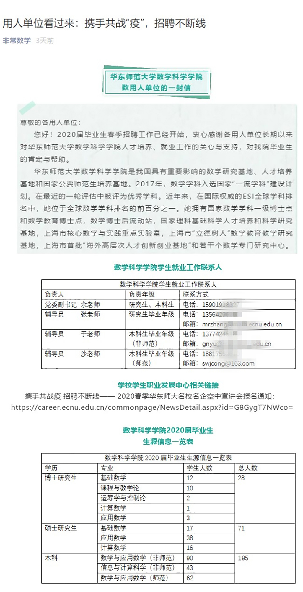 瞄准“未来教育家”,鼓励学生到祖国需要的地方去,为学生打通就业最后一公里。数学科学学院发挥师生团队力量,继续开展“未来教育家‘标准’画像行动”,凝聚学院教师、优秀校友、实习基地等多方团队力量,组织数学教师技能训练营暨教学技能大赛活动,学生师德、师风和教学技能得到了很大提升和锻炼。其中,仅硕士研究生毕业后选择从教中小学人数占到了75%以上。“党员骨干起表率,互帮互助共进步”活动中,优秀学生党员们组成就业先锋队,帮助学业、就业困难学生开展心理、职业咨询,促进毕业班同学共同就业。在抗击疫情期间“‘萌涯’在行动”寒假社会实践中,推动更多同学拜访家乡中学教师,了解基础教育现状,树立未来教育家信心。学院更是主动发出“用人单位看过来:携手共战‘疫’,招聘不断线”邀请信,线上线下全方位同时推进就业工作,线上邀请信发出后便迅速得到各用人单位的反馈;线下鼓励学生在家“停课不停学”,为疫情后的线下面试、签约做好前期铺垫工作。