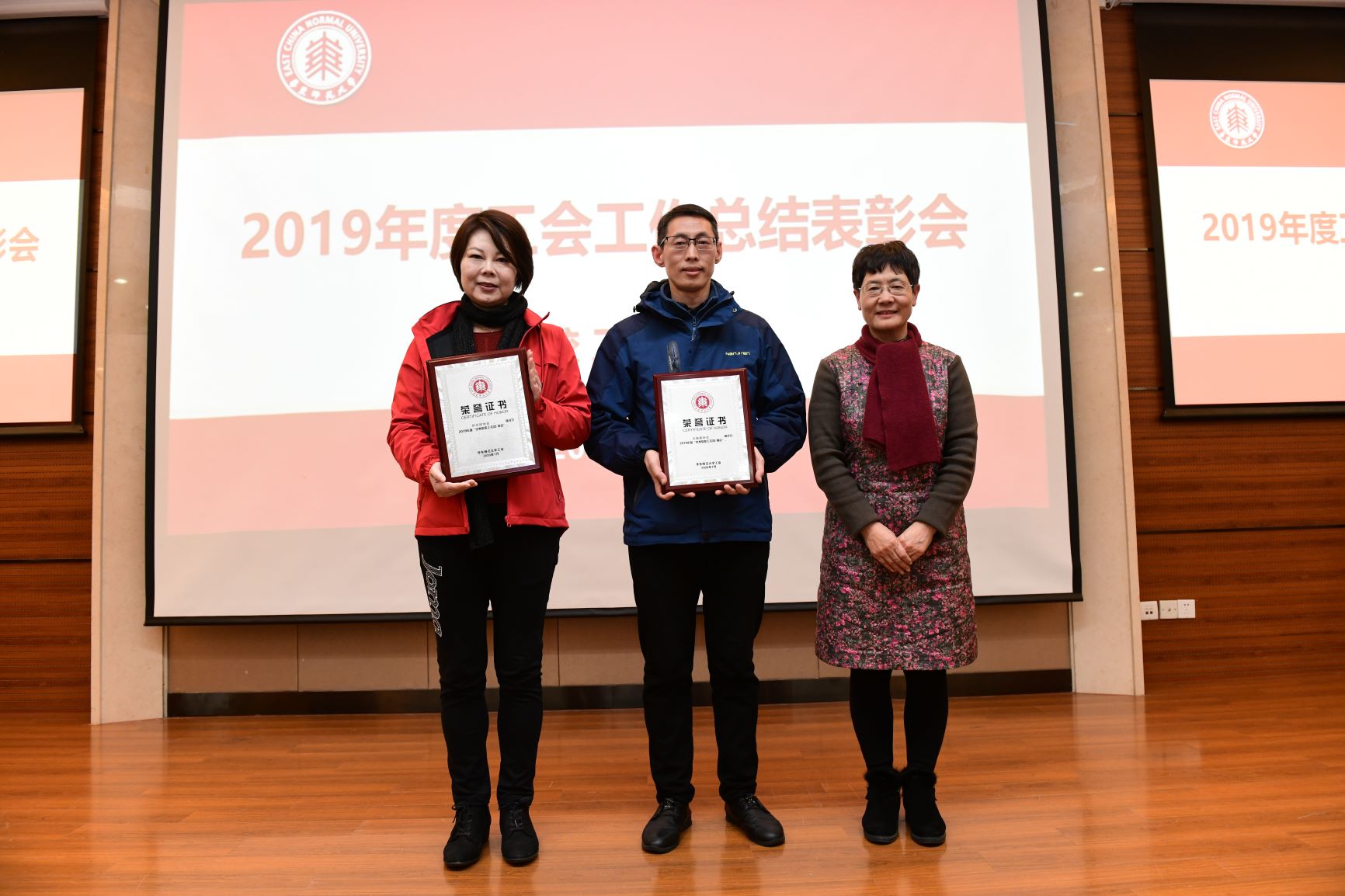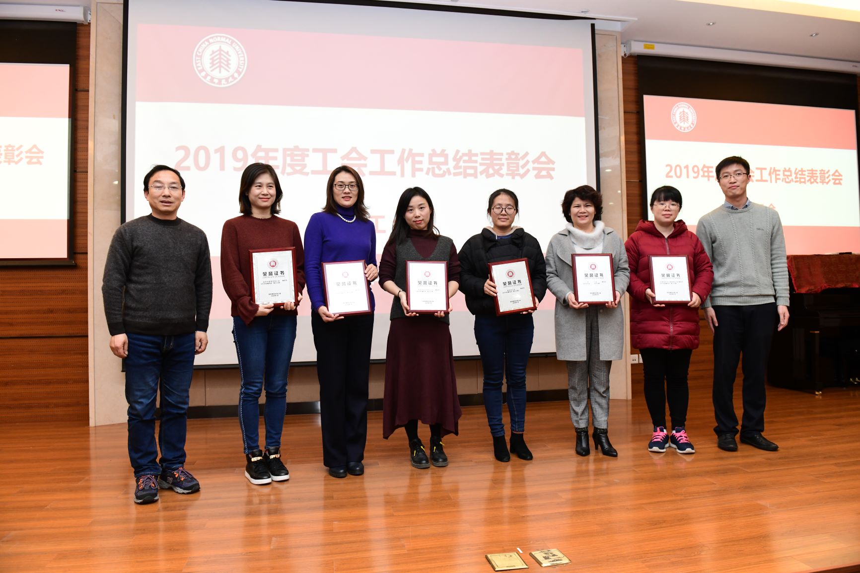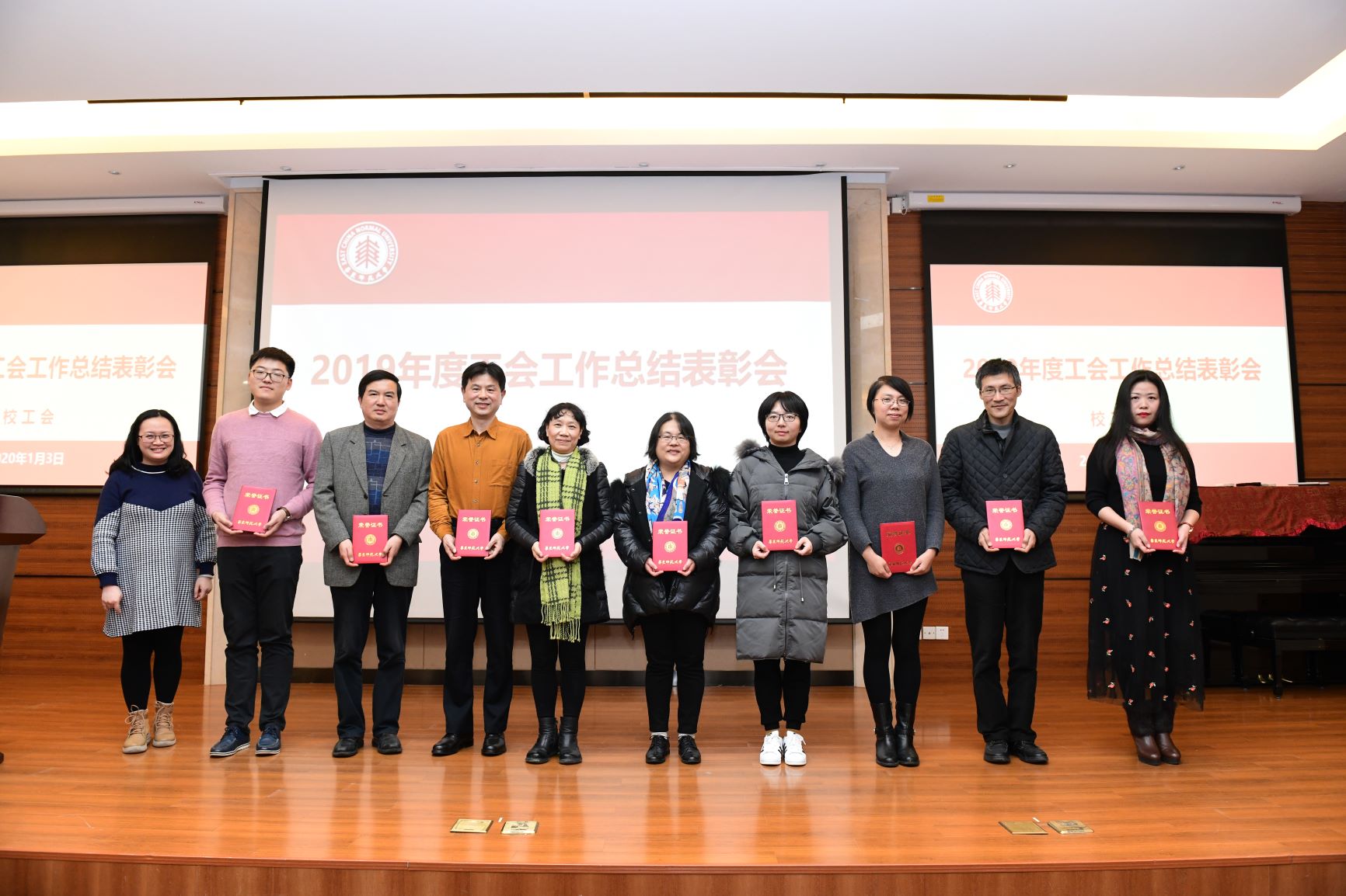 会上,陈立侨宣读了校工会《关于公布2019年先进教工小家免检单位、先进教工小家、优秀协会、优秀工会干部和优秀工会积极分子评选结果的通知》,河口海岸科学研究院工会获2019年度校“教工小家”免检单位称号;中国语言文学系等12家部门工会获2019年度校先进“教工小家”称号;太极拳协会和乒乓球协会获2019年校优秀协会称号;刘晓丽等33位同志获2019年度校优秀工会干部称号;凤媛等122位同志获2019年度校优秀工会积极分子。王平、杨素华、陈立侨以及与会的校工会“两委委员”斯阳、嵇渭萍、房建军、杨海燕、石云、陈旦锋、洪燕等为获奖的集体和个人颁发了获奖证书。