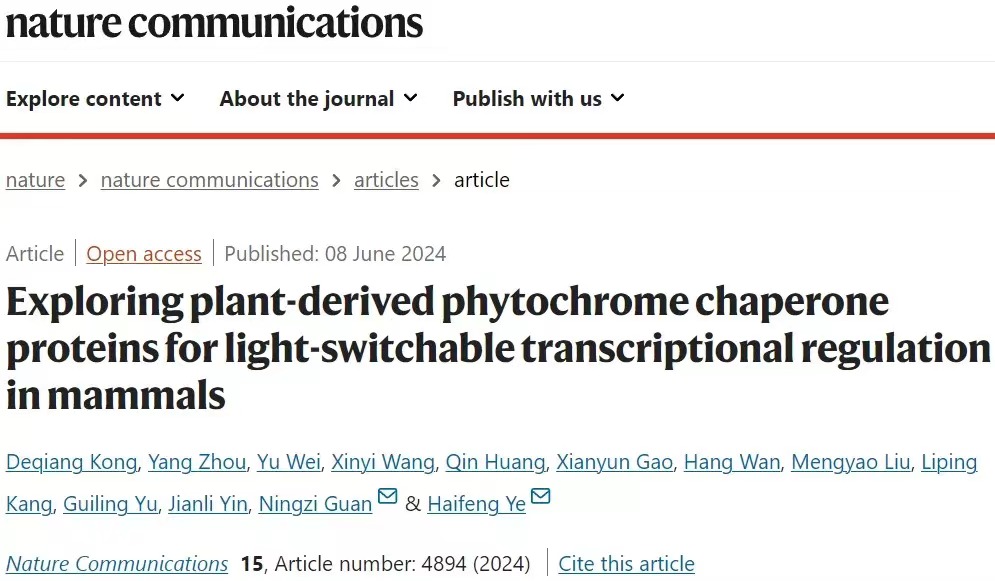 2024年6月8日,beat365英国官网网站生命科学学院、上海市调控生物学重点实验室、医学合成生物学研究中心叶海峰团队在 Nature Communications 期刊发表了题为“Exploring plant-derived phytochrome chaperone proteins for light-switchable transcriptional regulation in mammals”的研究长文。该研究首次发现植物来源的光敏色素伴侣蛋白在哺乳动物细胞中具备转录激活子活性,进一步开发出了一种新型的光开关转录调控系统(PTRC),为生命科学基础研究和生物医学工程应用研究带来了更大的可能性。
