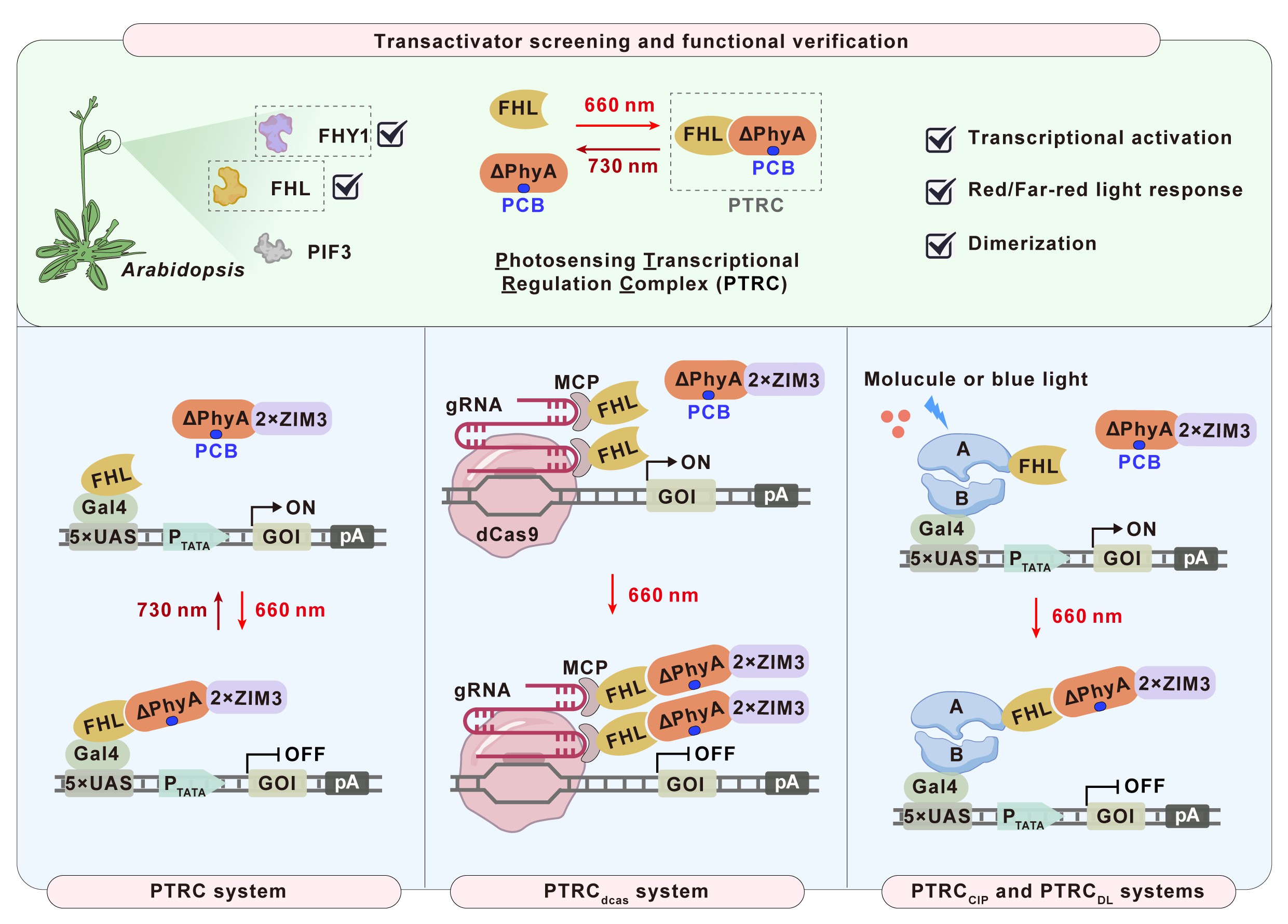 为了验证该猜想,通过与不同的 DNA 结合结构域进行融合,研究团队在哺乳动物细胞和小鼠中验证了来自拟南芥的光敏伴侣蛋白 FHY1 和 FHL 具有转录激活子的功能,并利用其与 PhyA 在光照下可异源二聚的能力,构建了一个可在光照条件下切换的转录调控复合体(PTRC)。在红光和远红光的照射下,PTRC 可以在活跃和非活跃状态之间切换,就像我们按下电灯开关一样简单。