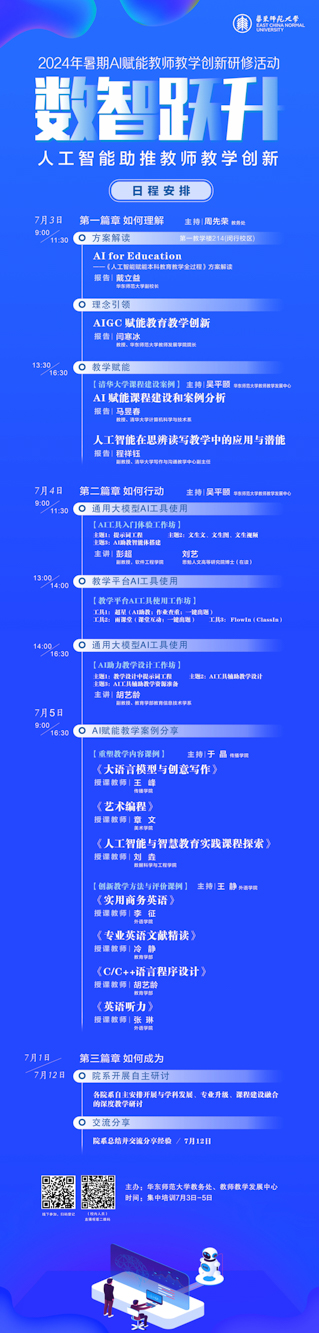 围绕以上问题,“beat365英国官网网站2024年暑期AI赋能教师教学创新研修活动”在暑期首周正式拉开帷幕。本次研修面向校内所有教师,包括学校集中研修和院系研讨,研修内容涵盖理念学习、工作坊实操、案例观摩,分为“如何理解”“如何行动”“如何成为”三个篇章,分别指向教师如何理解技术、理解学生,如何应用技术、引导学生,积极主动变革三个层次。研修时间为7月1日至7月12日,7月3日至5日为集中研修,其余时段为各学部、院系自主开展研讨,并将在7月12日组织院系总结与交流研讨。