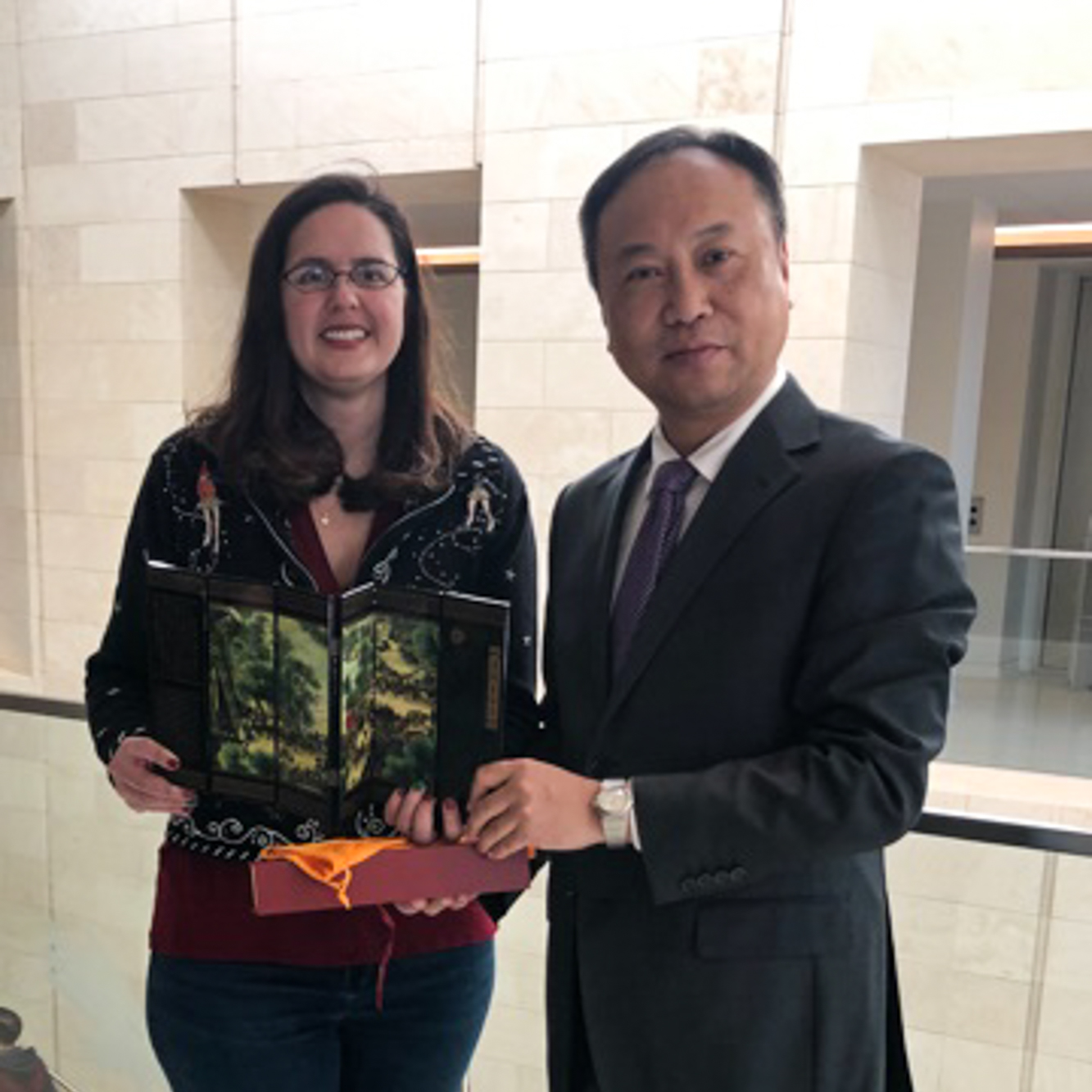北德克萨斯大学教务长Jennifer Evans-Cowley与副校长戴立益互赠礼物