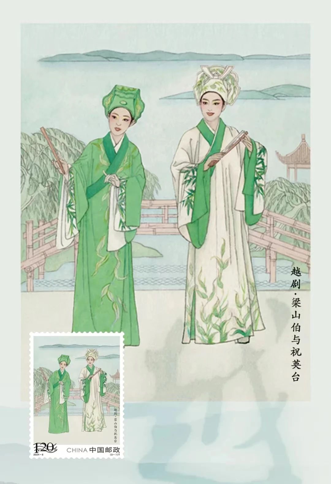 本套邮票巧妙运用中国传统工笔设色画法,画面细腻温婉,呼应越剧柔婉娴雅的艺术风格,生动展现了江南水乡的灵秀之气。对于邮票创作而言,需于方寸之间精雕细琢,既要展现绘画的精湛技艺,又要深刻挖掘题材背后的历史文化。