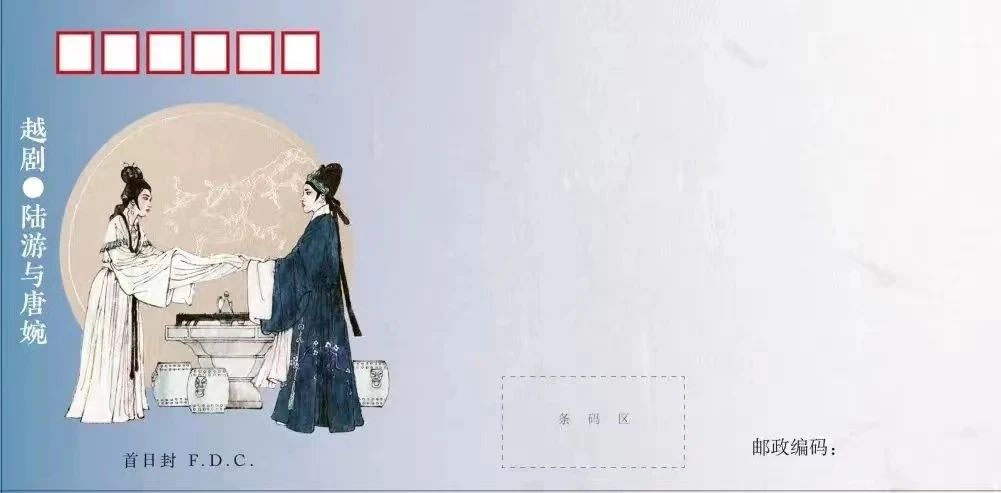 越剧《陆游与唐琬》讲述了南宋诗人陆游坎坷的仕途经历,以及其与妻子唐琬之间互为知音、相濡以沫,却最终不得不被世俗拆散的哀伤爱情故事。当紫外灯照射在邮票上,两句诗词将同一空间不同时间的场景叠映眼前,感慨之情难以名状。