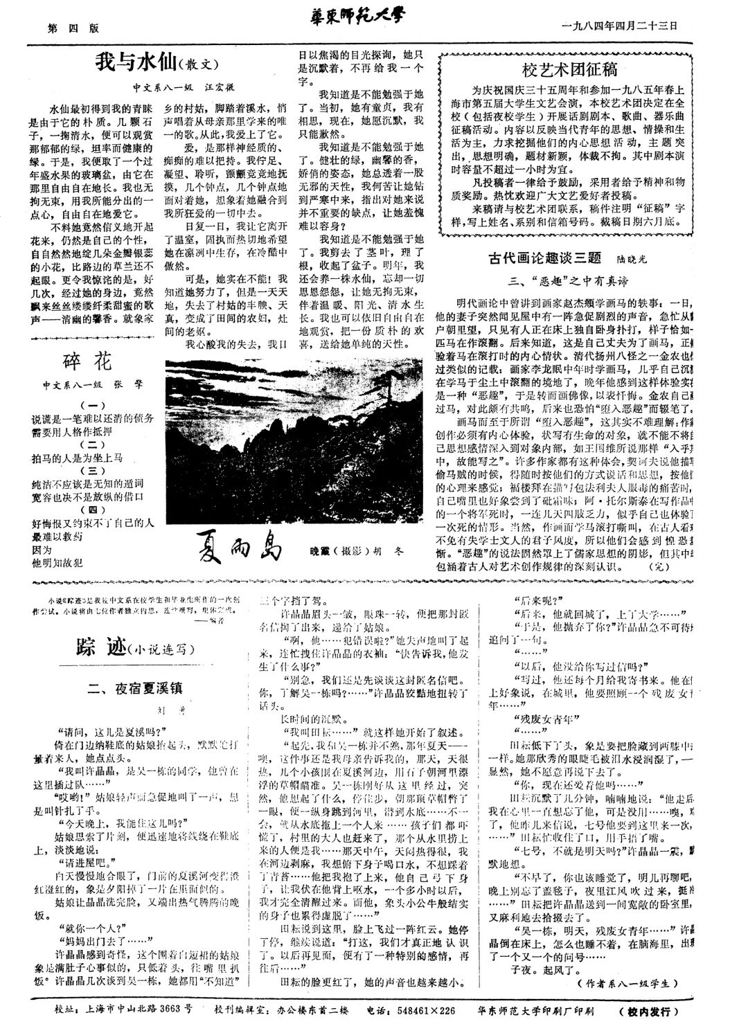赵丽宏、王小鹰、陈丹燕、格非(原名刘勇)、徐芳等著名作家学生时代在校报副刊“夏雨岛”上发表作品