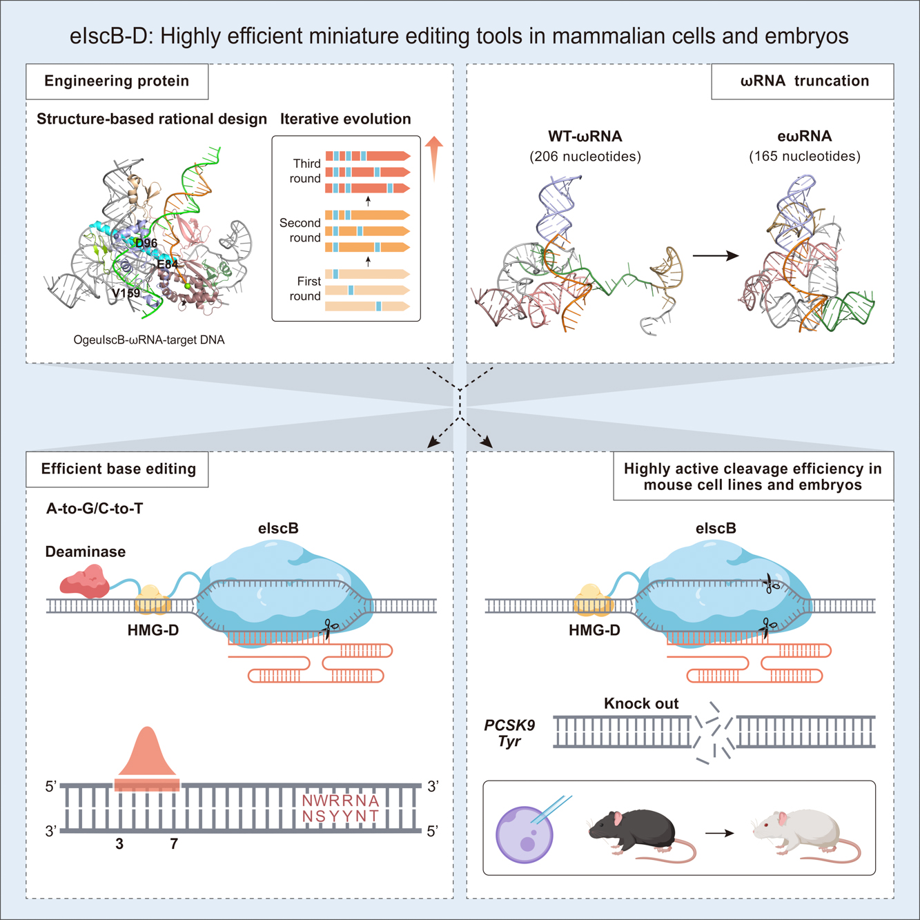 为了全面提升 IscB 的编辑效率,研究人员通过蛋白质工程化改造、RNA 结构优化、胚胎注射等技术获得在哺乳动物细胞及鼠源细胞系中具有超高活性的IscB变体(命名为eIscB-D)。一方面基于结构理性设计在 IscB 蛋白关键位置引物氨基酸突变,经过三轮迭代筛选,获得了增强型 IscB(命名为eIscB)。eIscB 平均编辑效率相较于野生型 IscB 平均可提高7.5倍。此外,研究人员通过融合一个非序列特异性双链 DNA 结合蛋白(HMG-D)提高IscB与目标 DNA 的亲和力,高活性 IscB(命名为eIscB-D)的最高编辑效率可达91.3%。另一方面,为了解决野生型 ωRNA 太长而难以进行工业合成的问题,研究人员通过晶体结构分析,对 ωRNA 的不同茎环结构进行改造,最终获得高活性的 ωRNA(命名为eωRNA)且长度相较于野生型 ωRNA 缩短了20%,大大降低了工业合成的难度。最后优化获得的 eIscB-D/eωRNA 编辑效率相较于原始 IscB/ωRNA 平均可提升20.2倍。