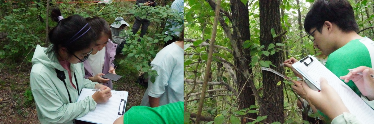 师生在南泥湾深林中开展样方调查