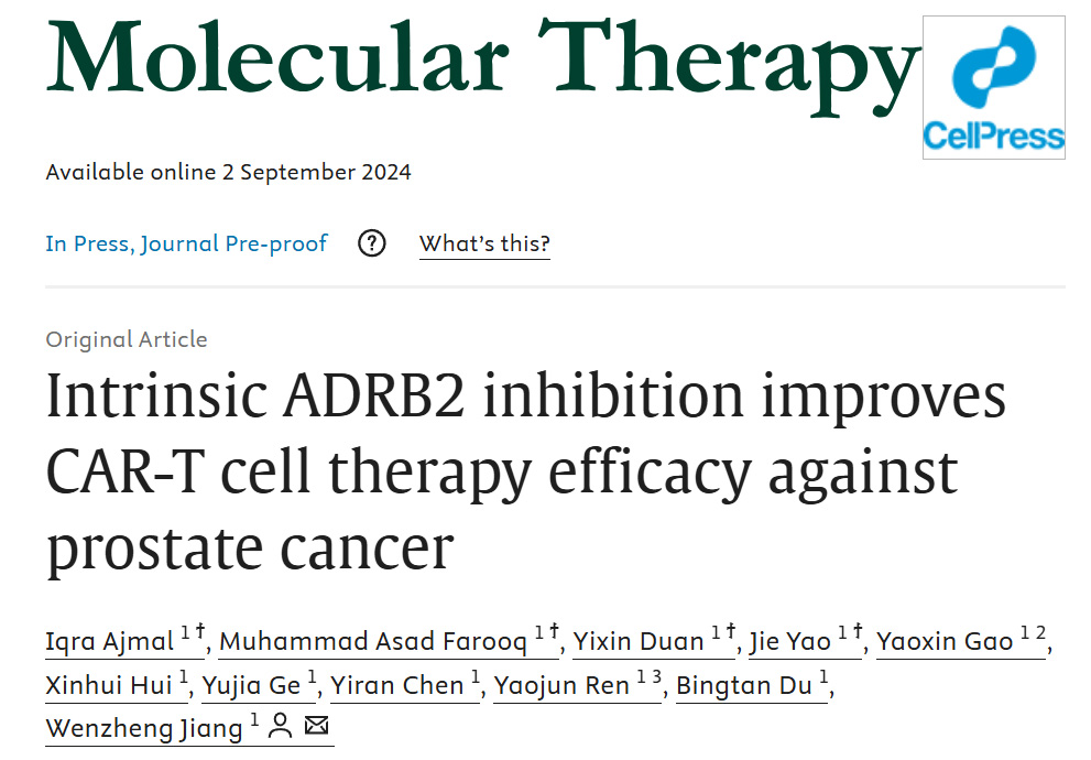 9月2日,beat365英国官网网站生命科学学院江文正教授团队在国际著名学术期刊《分子疗法》刊发了一种 ADRB2 缺陷的新型 CAR-T 细胞疗法可以增强对前列腺癌的治疗作用。肾上腺素受体2(ADRB2)在介导肾上腺素应激中起关键作用,长期以来一直是癌症治疗中的一大障碍。该研究团队通过一种创新的方法,采用 RNA 干扰技术敲低 ADRB2 基因的表达,逆转了肿瘤微环境中肾上腺素应激造成的免疫抑制的局面,使 CAR-T 细胞功能变得更加强大和具有抵抗肿瘤微环境抑制的能力,进一步提高了 CAR-T 细胞的治疗效果,为未来的临床与转化研究提供了理论和实验依据。