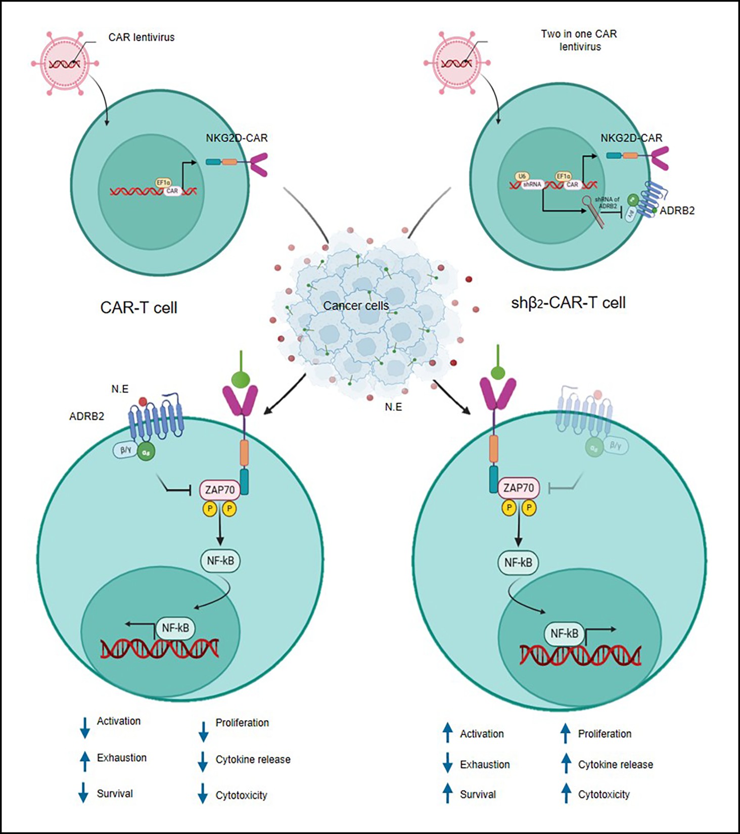 总的来说,CAR-T 细胞中 ADRB2 缺失成为一种改善细胞凋亡、增强细胞毒性和调节免疫检查点受体表达的有效策略。通过调控 ADRB2 信号,可以克服肿瘤抑制微环境的作用,为 CAR-T 细胞在治疗实体瘤提供了一种有前途的解决方案。