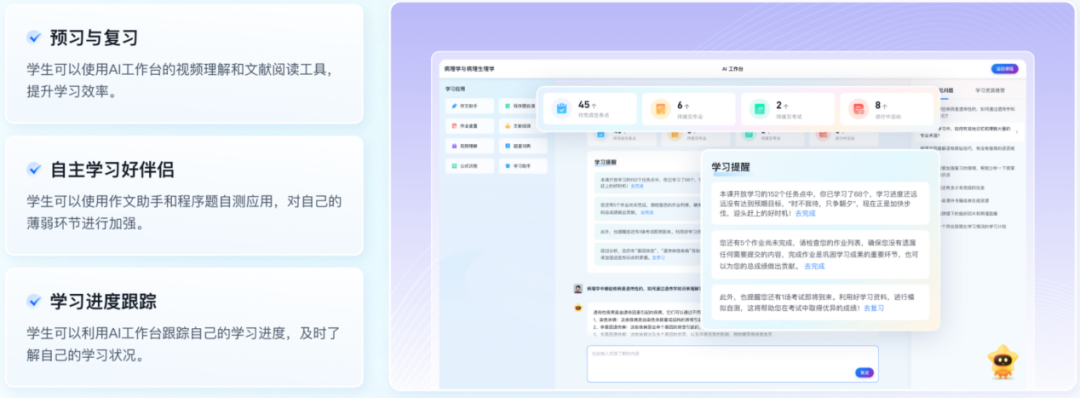 为推动超越知识点的教育,引导学生学会提问、质疑、解问,在“师-生-机”共同互动的新型教育模式中完成能力和思维的进阶跃迁,学校陆续研制EduChat、ChemGPT、 数智岐黄等系列大语言模型,在大夏学堂上线知识图谱、AI助教等智慧教学工具,着力开发智能教育机器人、AI 英语Go、小花狮助教、AI学工机器人等智能体,打造数智教材平台,重塑教育形态,以“超学科、重思维、智能化”支撑学生自由而全面的发展。