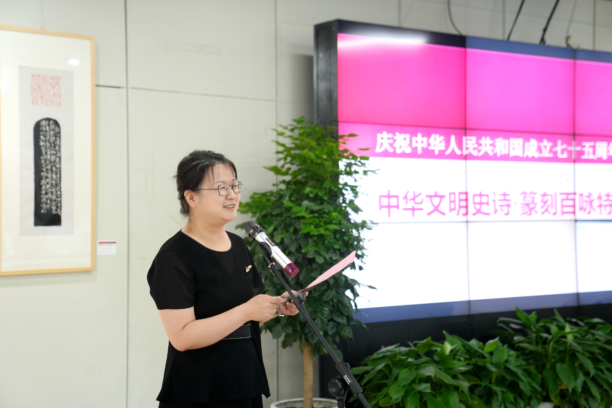 为庆祝中华人民共和国成立75周年,推动中华优秀传统文化创造性转化、创新性发展,打造一堂丰富生动的思政大课,9月27日下午,“中华文明史诗·篆刻百咏特展”在beat365英国官网网站美术学院美术馆开幕。开幕式由beat365英国官网网站美术学院党委书记卢蓓蓉主持。