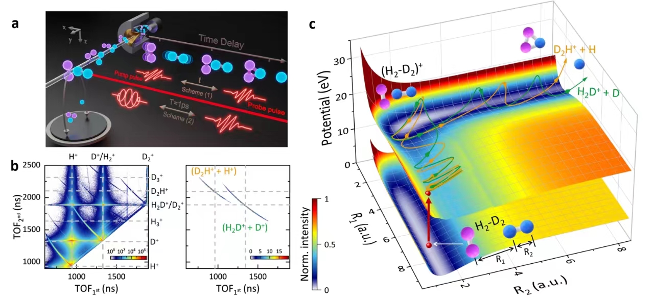 图2. 光诱导 H2-D2 双分子反应超快动力学实验探测。a实验装置示意图,b离子飞行时间符合谱图,c双分子反应势能面和反应轨迹。