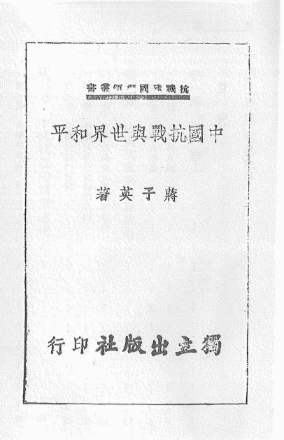 《中国抗战与世界和平》一书于1940年由上海独立出版社出版,印刷于重庆,这是蒋子英关于抗战的重要代表作。该书围绕“为生存”主题表达了三层含义:其一,“为生存”是人类最高也是最迫切和最重要的目的;其二,“为生存”是人类正当的、也是神圣不可侵犯的权利,是国际公法上一个重要的原则;其三,一旦这种权利被侵犯,当事民族或国家的全部人民必须全力去抗争,誓以一切牺牲去抵抗,直到最后的胜利。