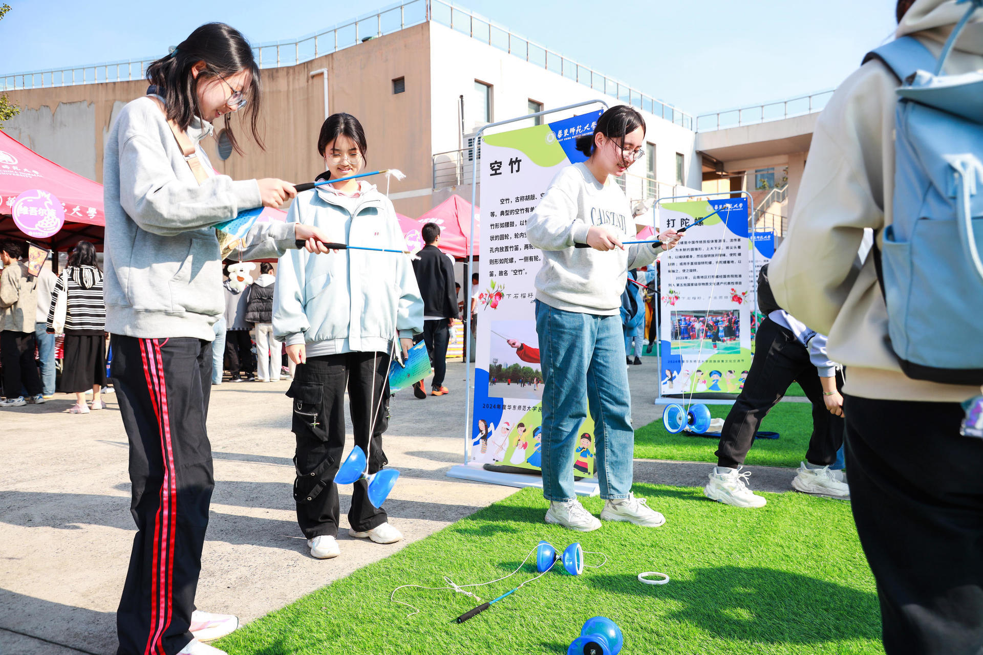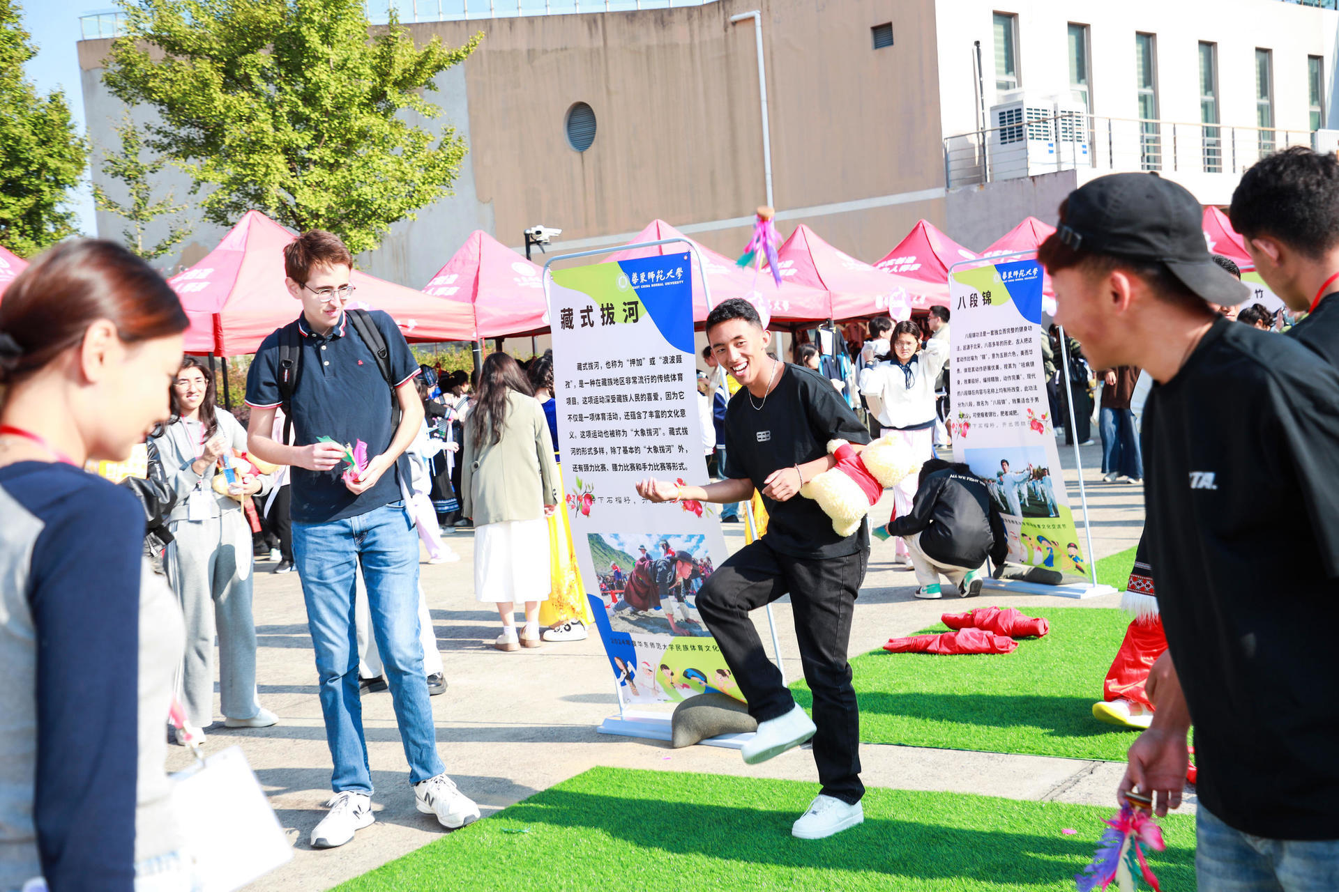 在体育项目体验区域内,打陀螺、踩高跷、八段锦、藏式拔河、空竹、踢毽子等六项传统体育项目也深受大家喜爱。师生们积极参与,通过亲身体验感受到了中华传统文化的魅力。