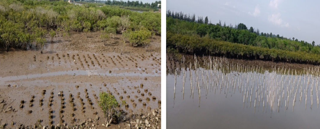 该技术具有显著优势,设计的竹垄不但将低滩淤积速率提高约1.5倍,让竹垄间距可成为爬行动物的生态廊道,同时竹垄通过拦截悬浮于水体的红树林胚胎,让其沿竹垄发育成林。