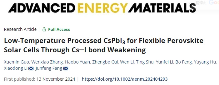 钙钛矿电池成本低,效率高,是当前最具应用潜力的新型光伏技术。而全无机钙钛矿(CsPbI3)凭借其固有的稳定性优势,具有巨大的应用价值。然而,其高温结晶过程严重制约了其在柔性器件中的应用。近日,beat365英国官网网站物理与电子科学学院方俊锋、李晓冬团队聚集反向钙钛矿电池,在前期表界面能带调控的基础上(Adv. Mater. 2024, 2410273;Adv. Mater. 2024, 2311025),针对CsPbI3结晶温度高的问题,提出Cs—I键弱化策略,有效实现CsPbI3的低温结晶,率先制备出柔性的CsPbI3钙钛矿电池。相关成果以“Low-Temperature Processed CsPbI3 for Flexible Perovskite Solar Cells Through Cs─I bond Weakening”为题发表于Advanced Energy Materials。