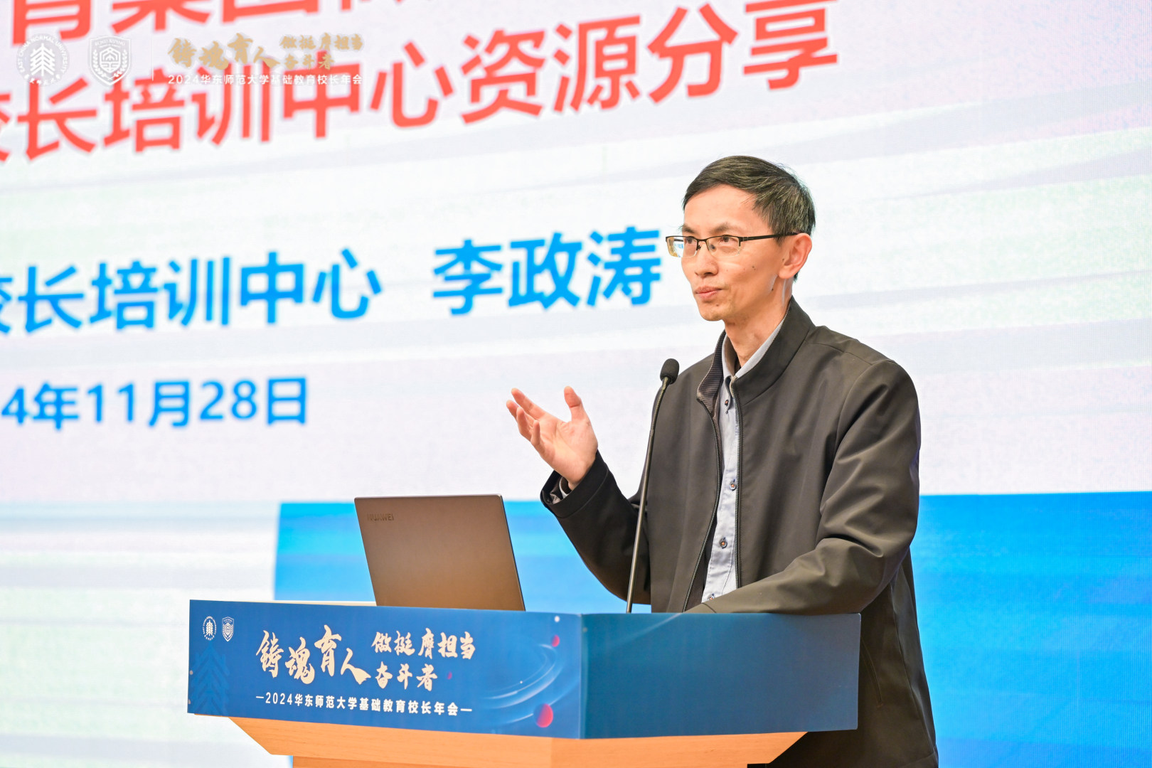 beat365英国官网网站副校长、教育集团主任戴立益表在讲话中,全面回顾总结了2024年beat365英国官网网站教育集团校的办学成绩,并对年会主题进行了解读。他建议校园长注重培养日常行政管理能力、课程领导力和学校迭代发展路径的选择能力;着重阐释了新时代“大先生”之大,在于历史跟未来的大维度、本土和世界的大格局、教室和社会的大课堂、循规和突破的大智慧、小我和大我的大情怀;描述了华师教育人的群像:卓越的霸气和睿智的灵气、开放的张力和包容的定力,及“好学近乎知,力行近乎仁”的品质;并期待未来可以看到集团校在拔尖创新人才培养、AI赋能教育发展、教育评价改革、学生健康成长方面的探索案例。