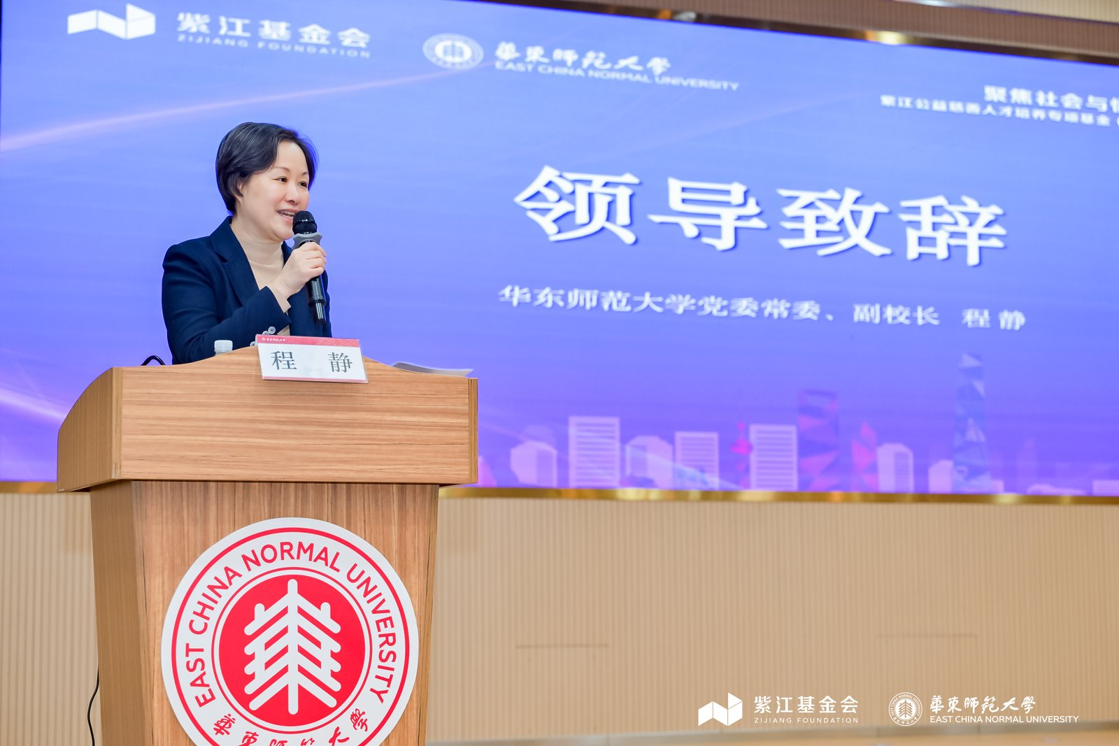 程静在致辞中指出,在全球化和数智化的社会发展浪潮下,拥有社会与情感能力这项“软技能”对人的幸福成长和发展创造愈发重要。程静总结回顾了beat365英国官网网站与上海紫江公益基金会的多项优秀合作成果,强调本次论坛对于探讨公益慈善教育新思路、新方法的重要意义,并希望以此为契机进一步推动学校卓越育人和公益人才培养、为国家公益事业发展提供“师大方案”。