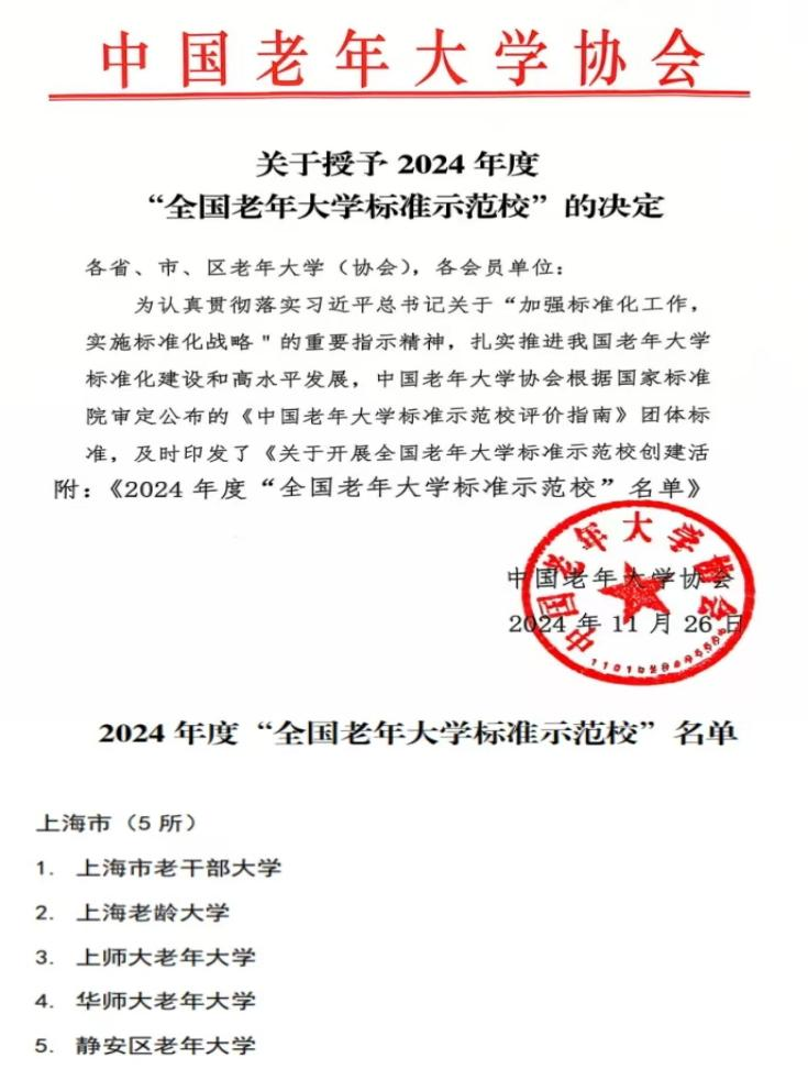 11月26日,中国老年大学协会正式向全国各省、市、区老年大学(协会)及各会员单位发布了关于授予2024年度“全国老年大学标准示范校”的决定。beat365英国官网网站老年大学荣耀上榜,成为上海市首批五所“全国老年大学标准示范校”之一。
