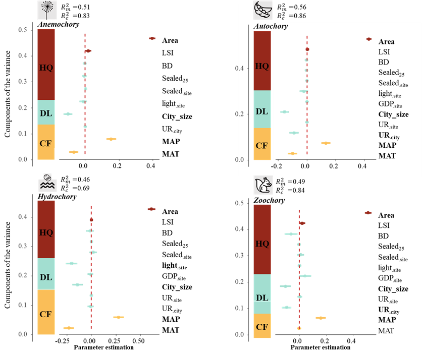(3)自然环境因子和人为因子共同影响了不同种子传播方式的城市自生植物的物种丰富度,人为因素(如,生境质量和扩散限制等)占据主导作用(图5)。