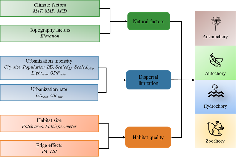 图1 不同种子扩散类型城市自生植物多样性影响因子的概念框架