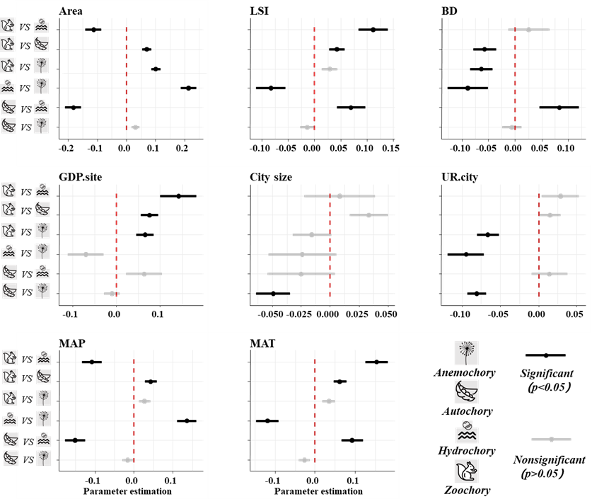 (2)自体传播植物对扩散限制最为敏感,而水传播植物对于生境质量和气候因子较为敏感(图4)。